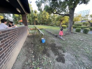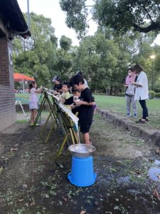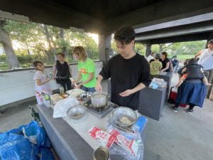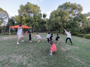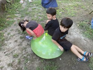 調理の合間に子どもたちは、巨大水風船や大縄でお腹を空かせます。