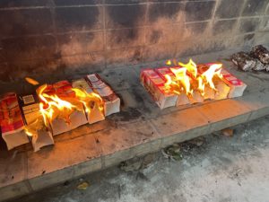 アルミホイルに巻いたホットドッグを紙パックに入れて燃やしていきます🔥🔥🔥