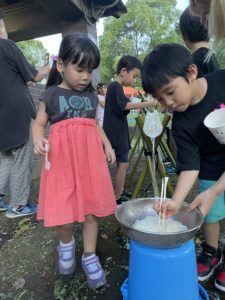 竹の流しそうめん台に子どもたちも大人も大興奮でした。