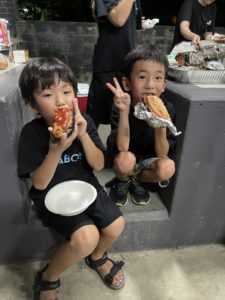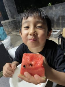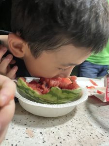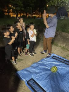 みんな大好きスイカ割りです。空手道場らしく、手で割ります🍉
