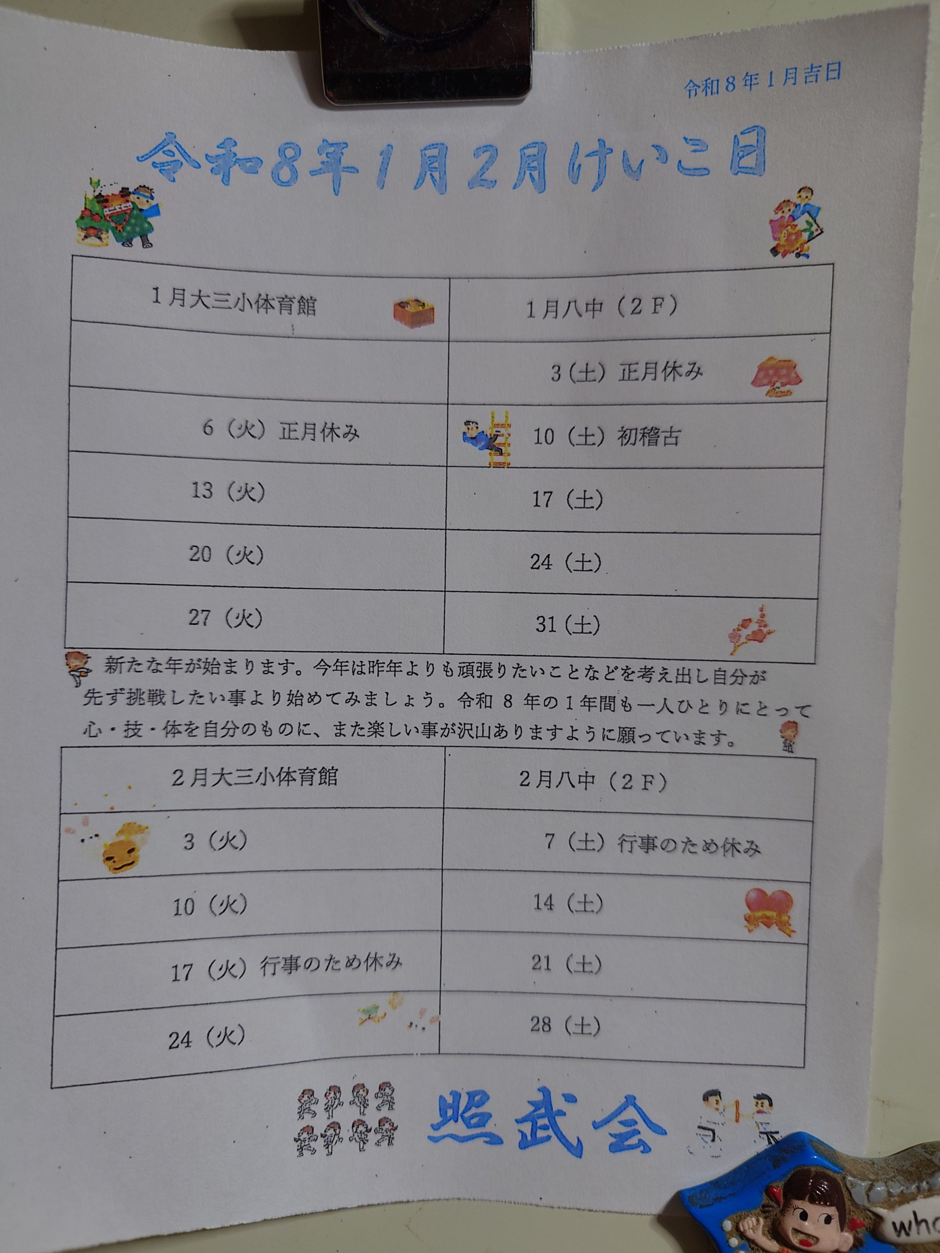 1月2月の予定表 2025年12月29日 67PV ブログ 来年の初稽古は1月10日(土)からです。 寒さにも負けずに頑張っていきましょう。押忍! 「個人話18」 「今週の剛士10」 コメントを残す コメントをキャンセル名前 (必須) メールアドレス(公開されません) (必須) ウェブサイト 次回のコメントで使用するためブラウザーに自分の名前、メールアドレス、サイトを保存する。 上に表示された文字を入力してください。コメントコメント送信