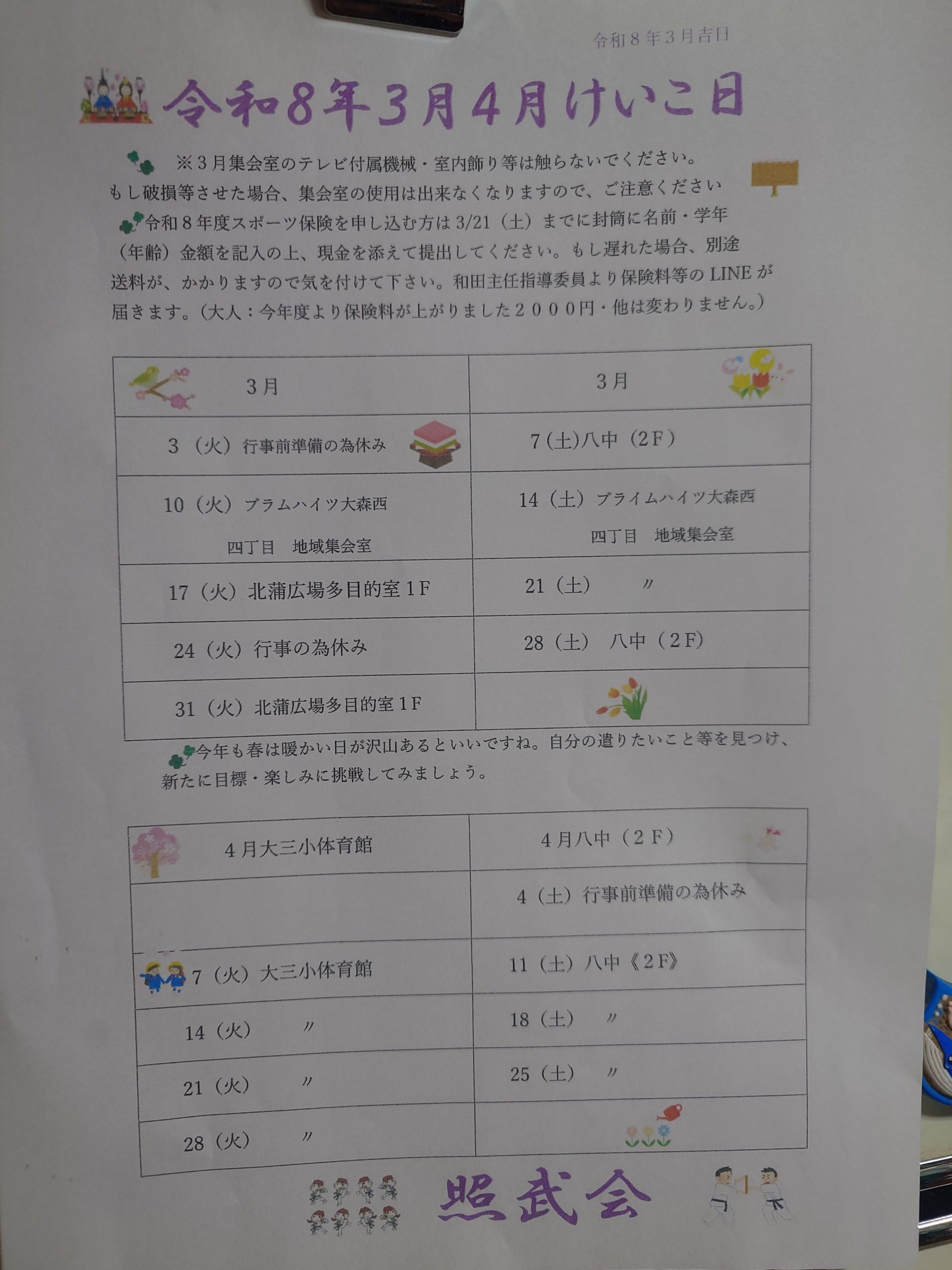 3月4月の予定 2026年2月28日 26PV ブログ 遅くなって申し訳ありません3月4月の予定です。 3月は学校行事の関係で場所がかわりますのでご注意下さい。 花粉に負けず頑張って行きましょう。押忍! 「稽古43 大森 蒲田 小学校 中学校 空手 武道 格闘技 スポーツ バランスレッスン」 コメントを残す コメントをキャンセル名前 (必須) メールアドレス(公開されません) (必須) ウェブサイト 次回のコメントで使用するためブラウザーに自分の名前、メールアドレス、サイトを保存する。 上に表示された文字を入力してください。コメントコメント送信
